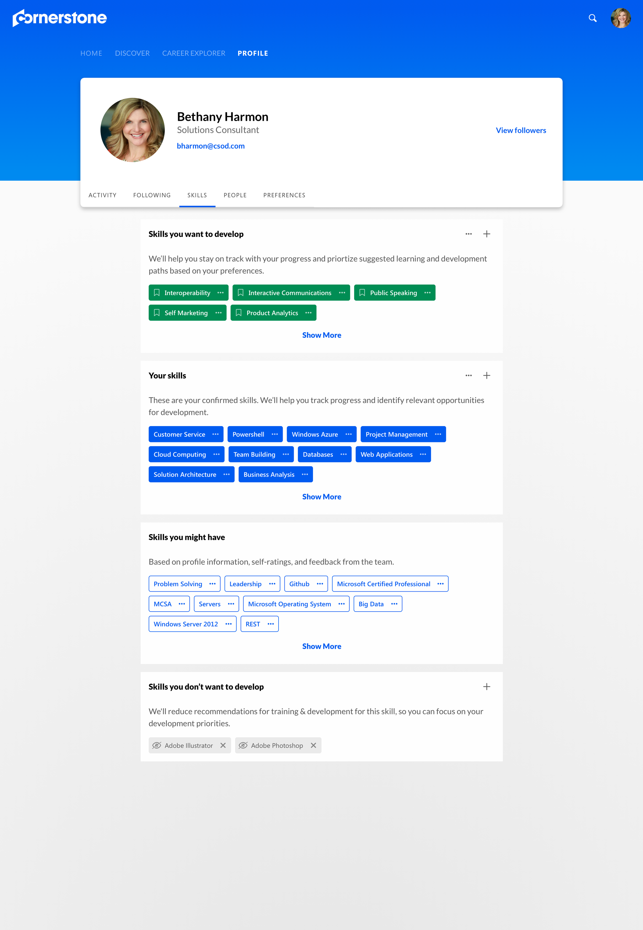 User can see everything about them in the Profile page from their recent activities exploring Xplor, determine their profession and skillset to help system understand them better, and follow peers in their organization.