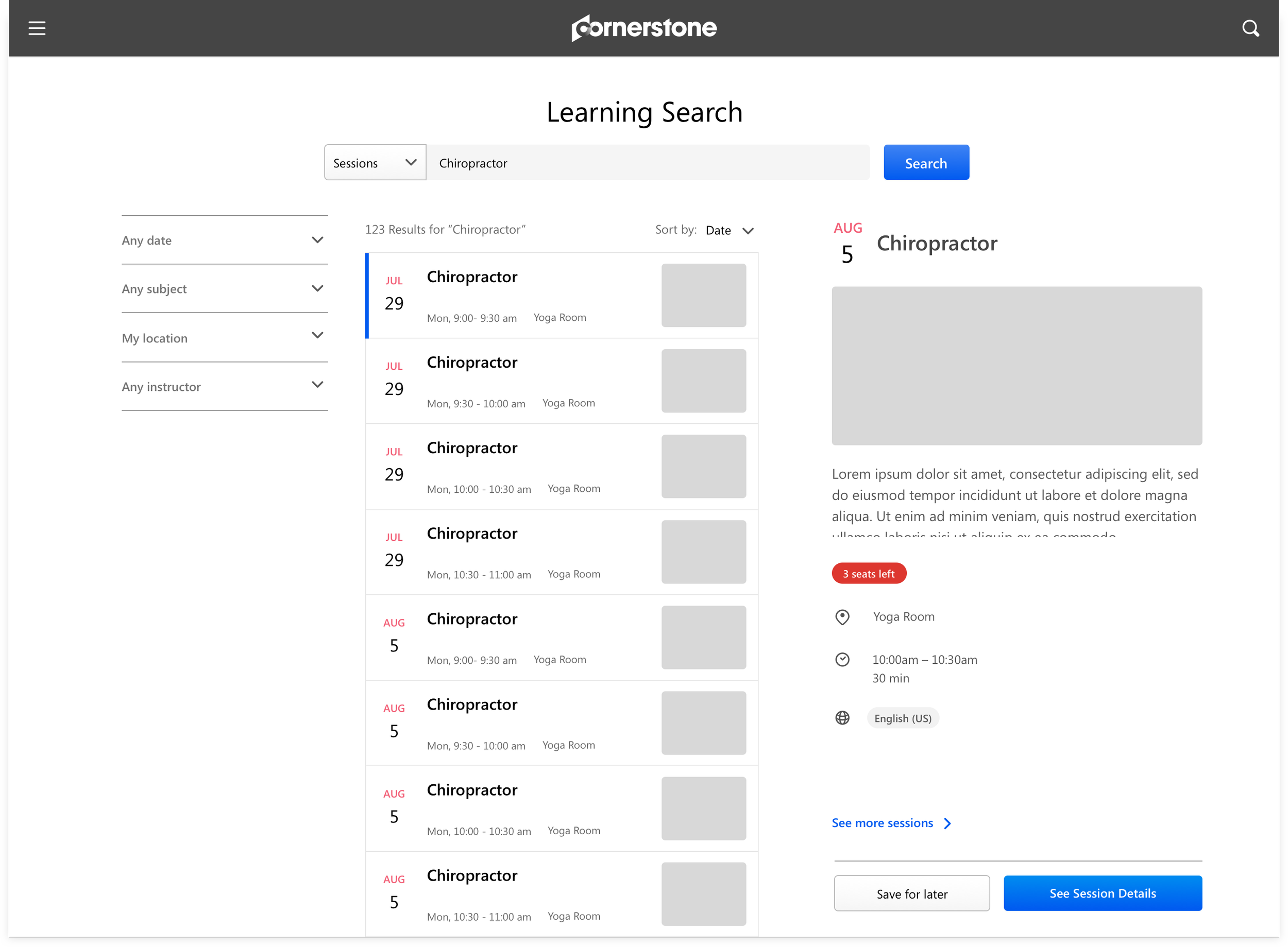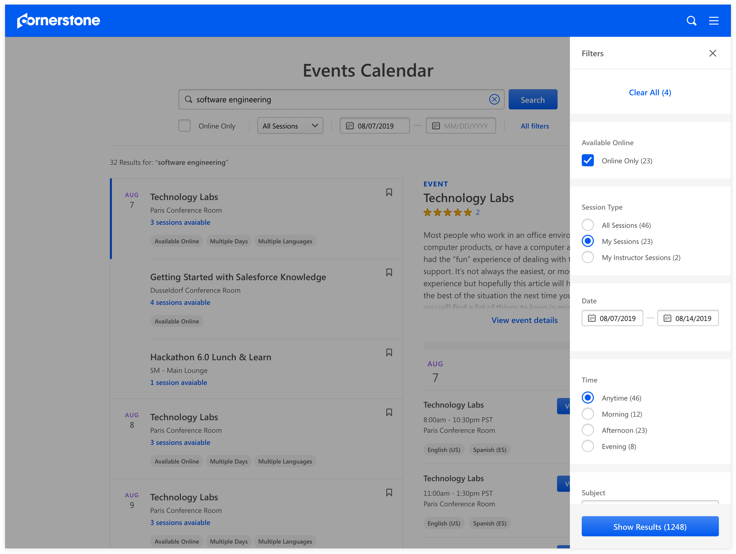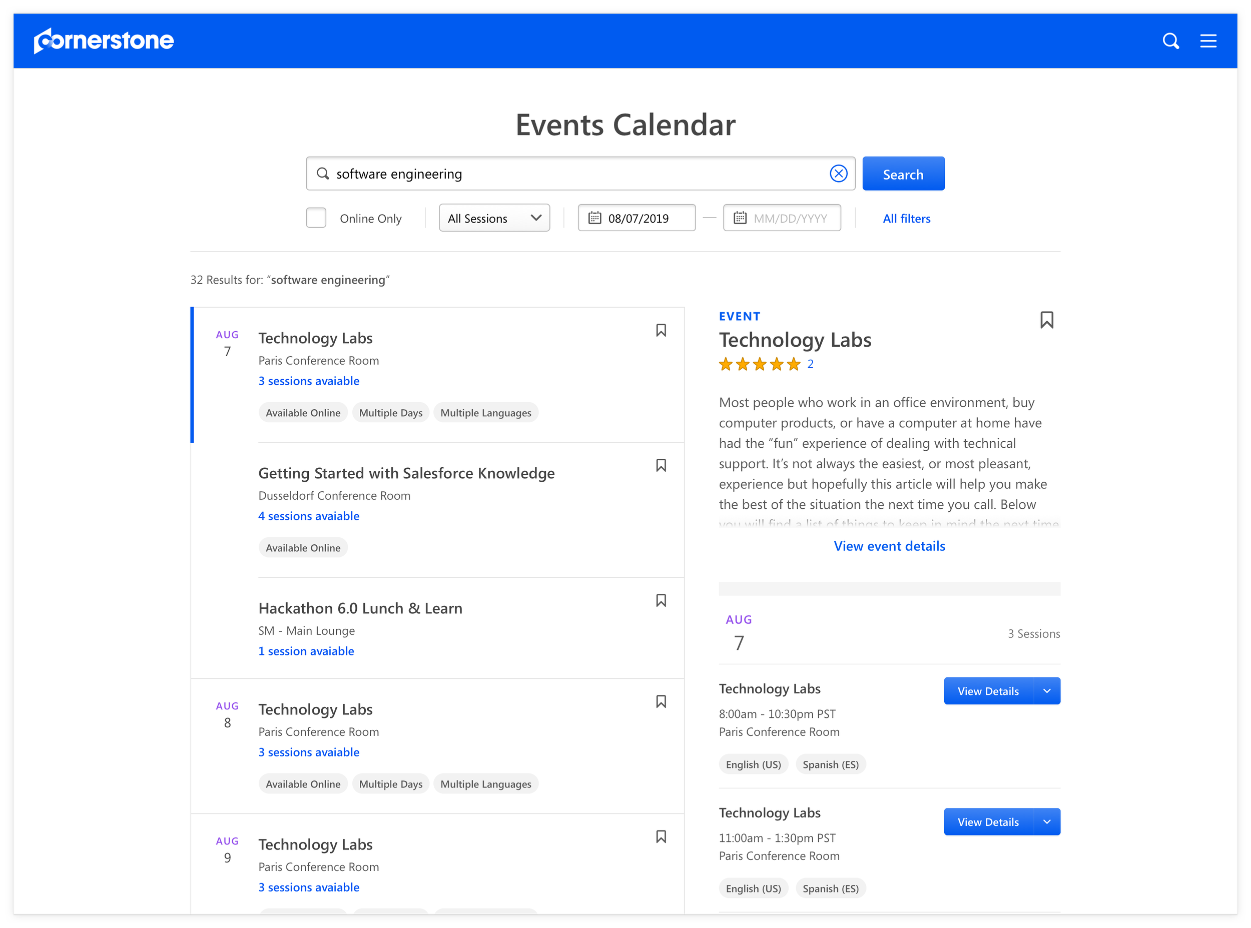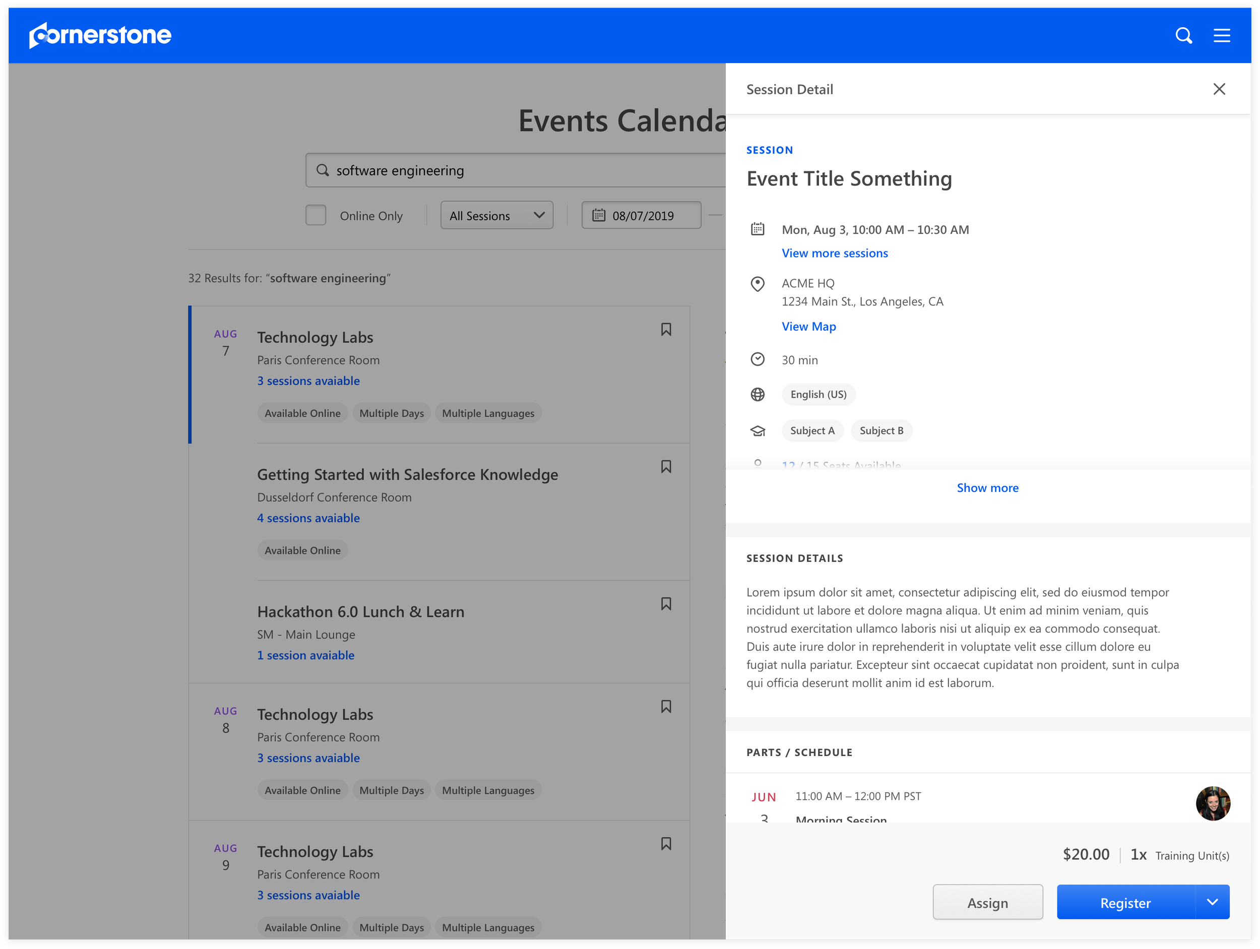 To encourage a frictionless experience for learners to register more events as intended, we designed the session details as a flyout in order to keep the learner in Events Calendar page. Learners were able to see the full details of the session and more importantly act on the session immediately.