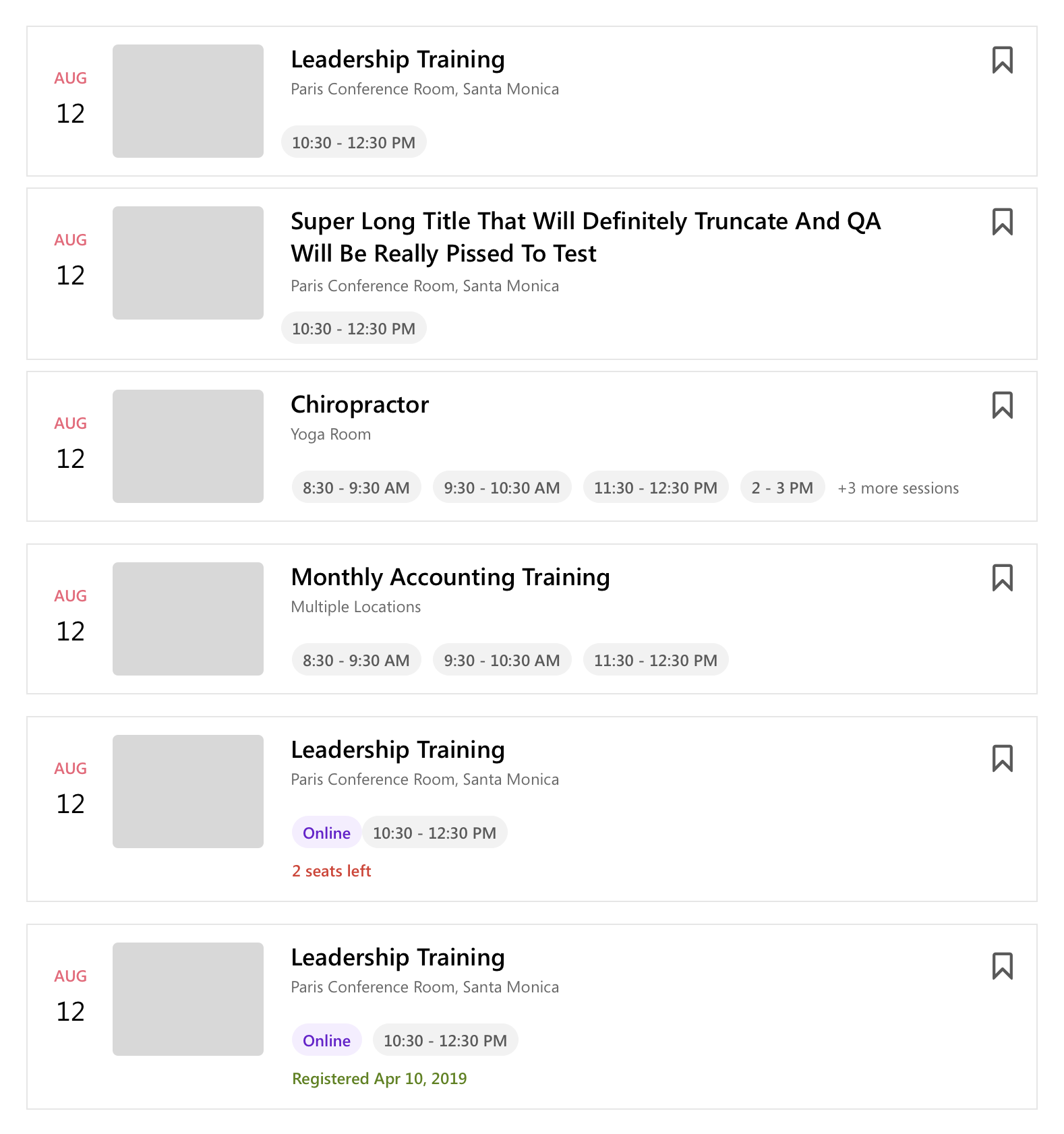 An event can have multiple sessions and learners have to deep dive in each individual session details in order to see information that matters the most to them such as availability.