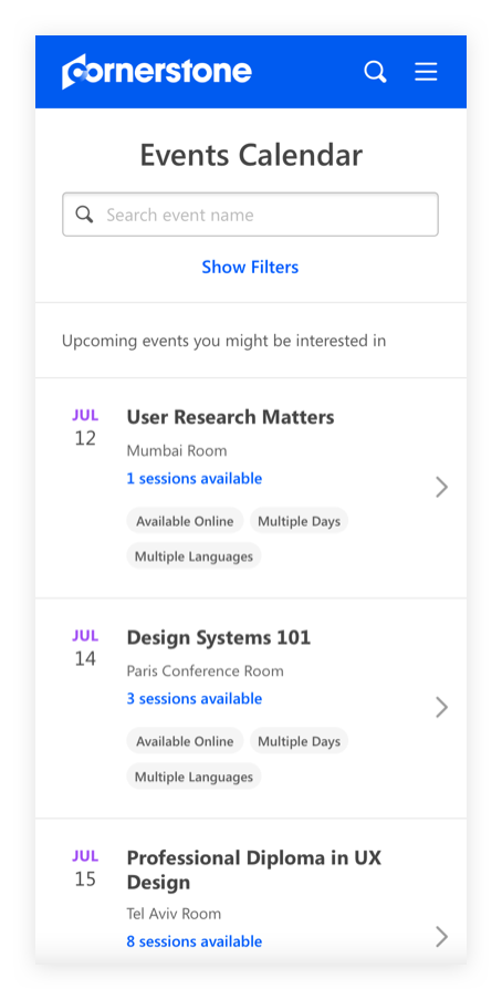 Most learners don’t browse for events. Instead they search for the event they are required to attend in order to immediately fulfill their work.