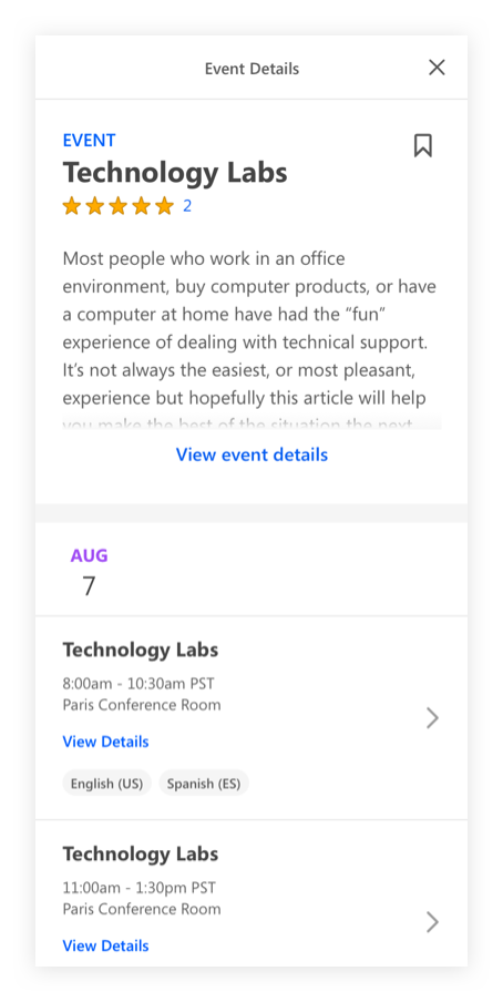 We explored other content card designs that showed more details upfront to help the learners validate the event they are searching for, but mainly to ensure they are close to finding what they are looking for. We also encouraged browsing by adding secondary actions on this level to ‘Save for later’.