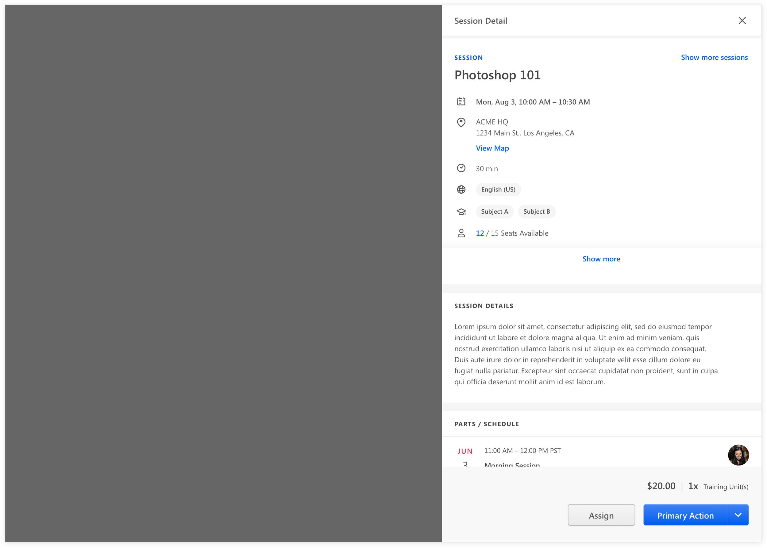 We noticed learners always want to confirm all details of an event before they commit to it. Instead of having the learner deep dive into an event page to a session page, we decided to allow user to preview the event details, as well, act on it immediately on the same page.